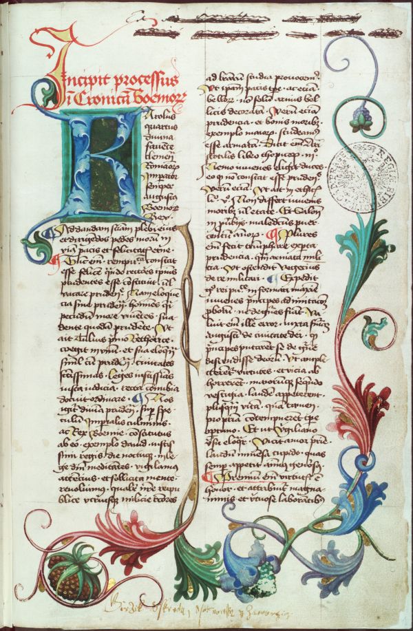 The initial K decorated by vegetative ornament and the border introduce The World Chronicle by John of Marignolli in the codex of the 15th century.